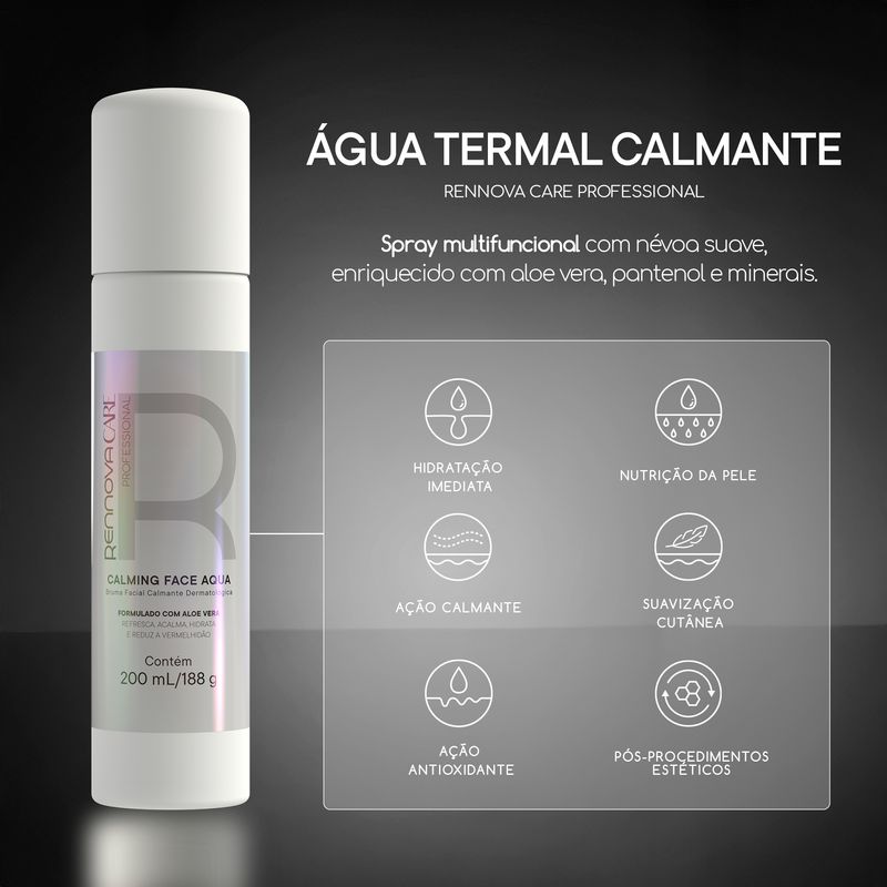 Spray multifuncional que libera uma delicada névoa enriquecida com extrato de camomila e aloe vera que possui propriedades calmantes e antioxidantes. Traz hidratação imediata para a pele com a ação do pantenol, além de possuir minerais que nutrem e suavizam, como o magnésio, zinco, manganês e cobre. Ideal para uso após a realização de procedimentos estéticos, alivia a pele sensível e sensibilizada.
